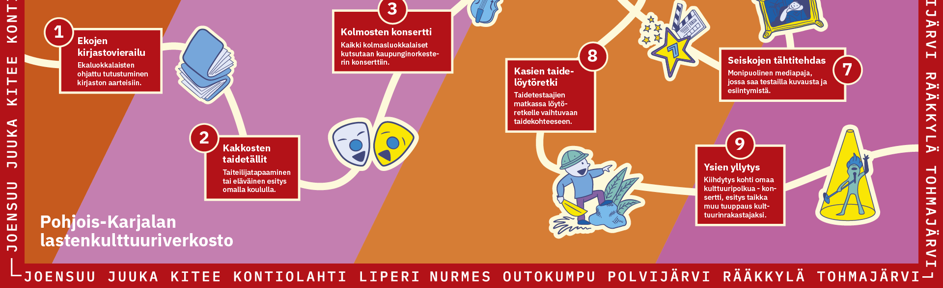Kulttuuritoiminta pohjautuu yhdessä koulujen kanssa laadittuun kulttuurikasvatussuunnitelmaan. Sen tavoitteena on tukea kulttuurin keinoin lasten ja nuorten kasvua ja taata kaikille lapsille mahdollisuus kokea erilaisia kulttuuritapahtumia. Kaikille koululaisille tarjotaan yhteinen kulttuurikokemus, jota toteutetaan yhteistyössä Pohjois-Karjalan lastenkulttuuriverkoston kanssa. Koululaisten kulttuuripolun vuosittaiset painopisteet suunnitellaan yhdessä verkoston kanssa ja niissä on alueiden välisiä variaatioita.